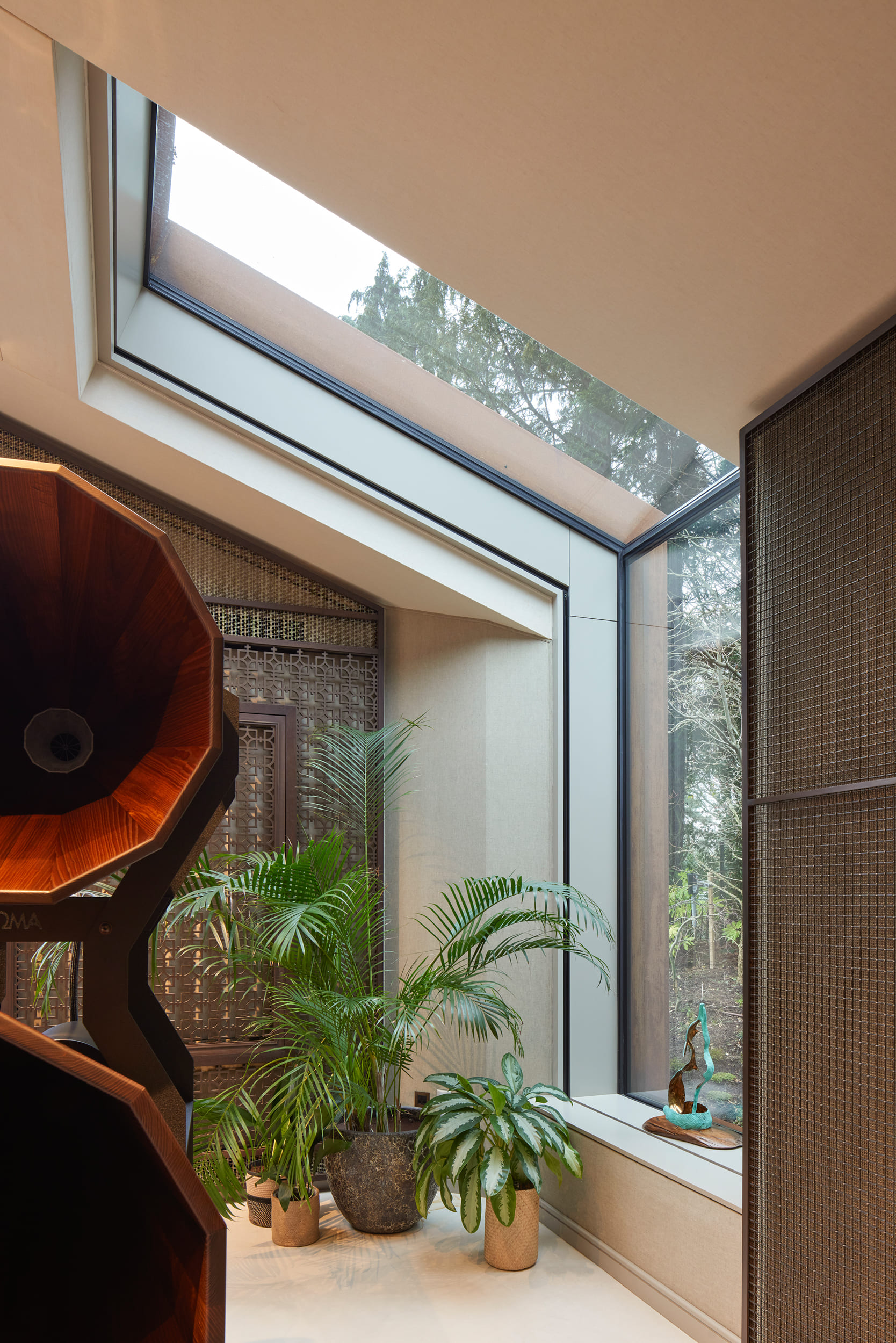 In the case of this particular client, an avid art collector and passionate audiophile, having previously renovated their Surrey estate we were further commissioned to create a pavilion dedicated to the enjoyment of music, one that carefully orchestrates views into the surrounding landscape.